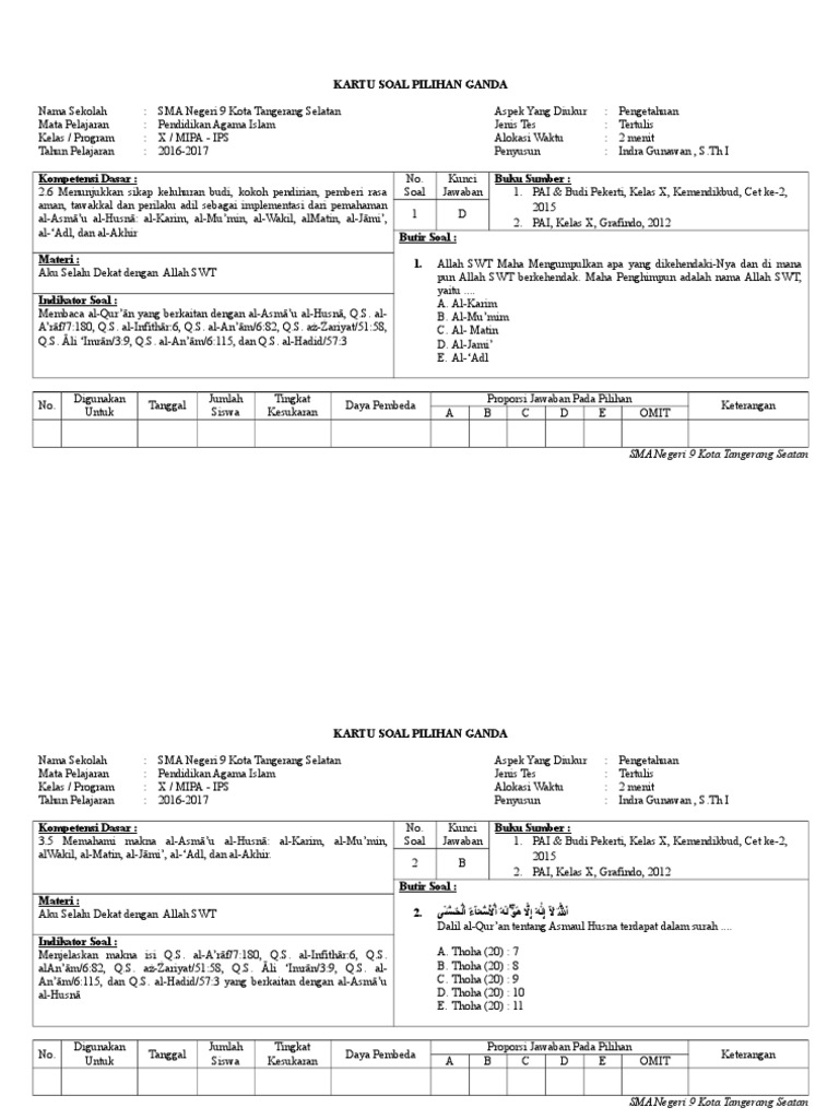 2016 2017 Kartu Soal Uas Ganjil Pai X